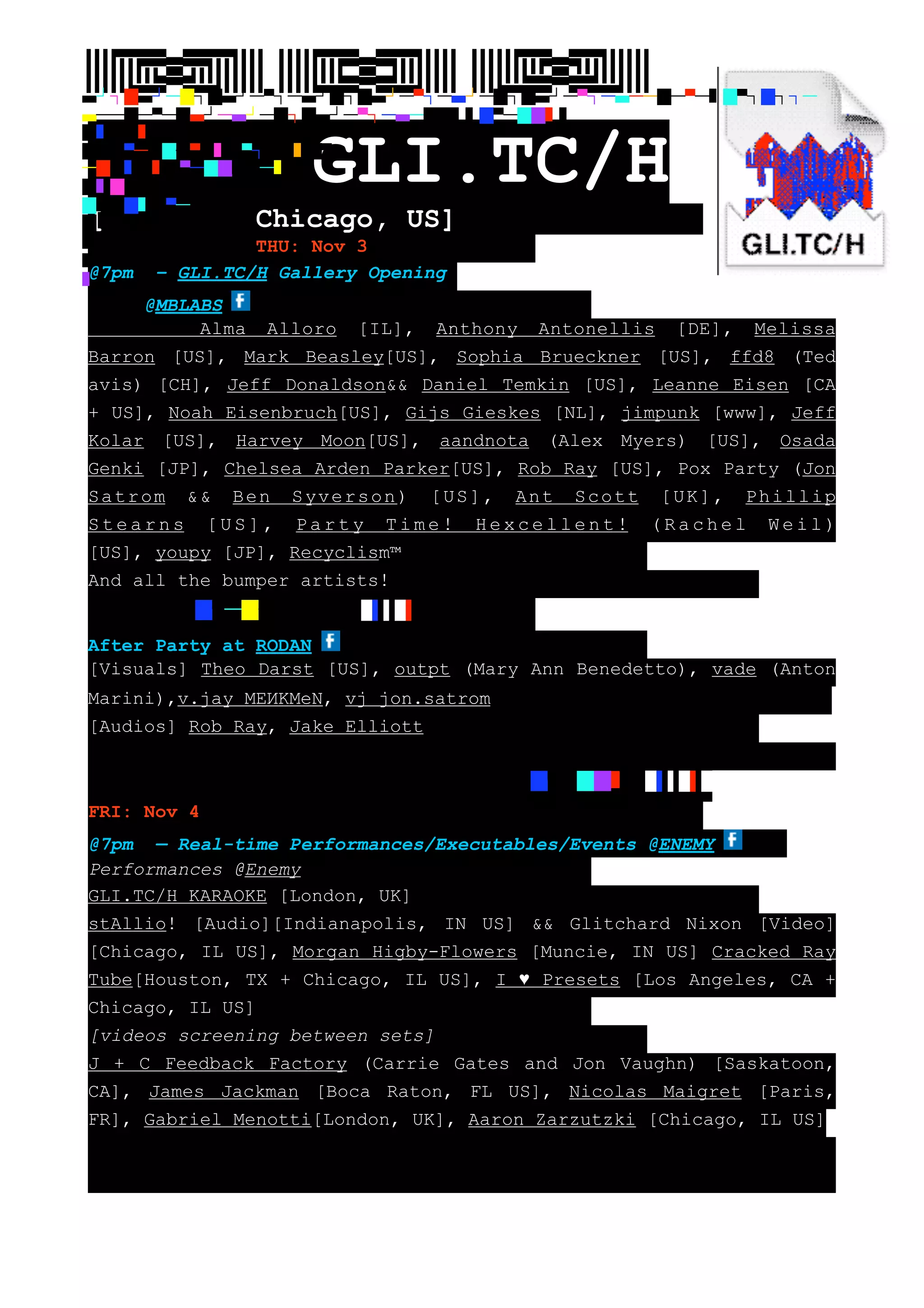 The document announces an art exhibition and festival called GLI.TC/H taking place from November 3-12 in Chicago and Amsterdam. It includes schedules of gallery openings, lectures, workshops, screenings, and live performances centered around glitch and error art. Events will be held at venues like MBLABS, Enemy, theNIGHTINGALE, STEIM, and PLANETART and will feature artists working with glitch, error, and digital media.