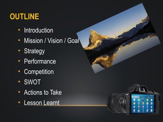 CEMO Enterprises is a camera manufacturer established in 2008 with its manufacturing plant in Taiwan. It produces multi-featured and entry-level cameras for export to North America, Latin America, Asia Pacific and Europe Africa. Its vision is to be the leading choice for premium cameras through continual innovation, and its mission is to offer superior quality cameras at good value. Its goals are to be a low cost provider and use the best cost provider strategy. CEMO faces competition from companies E, G and H in entry-level cameras and E, F and G in multi-level cameras. A SWOT analysis identifies strengths in credit rating and image rating, while weaknesses include a narrow focus and high warranty periods. Actions to take include minimizing costs