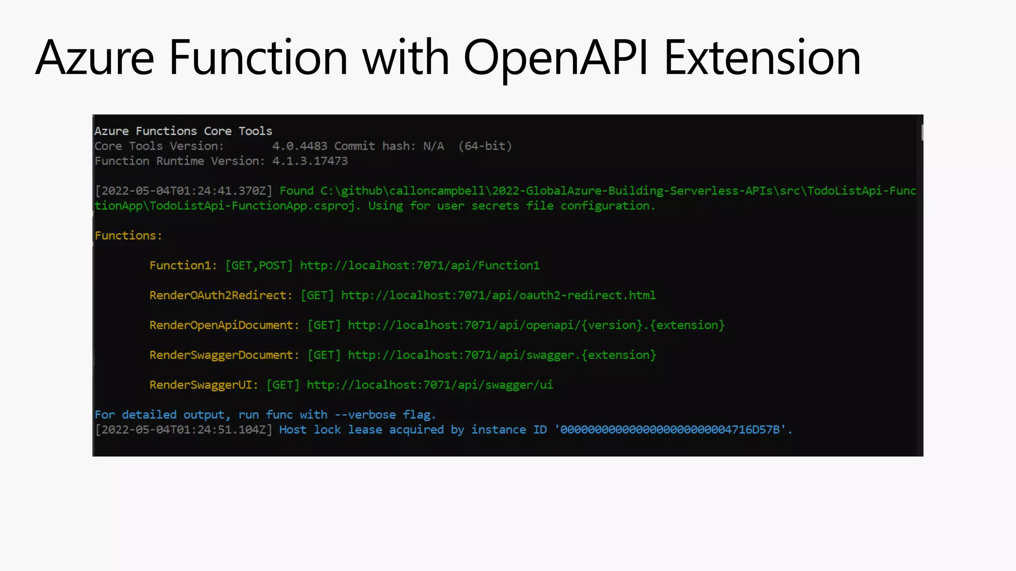 The document announces an Azure event in Toronto from May 5-7th that Microsoft is sponsoring. It provides information about accessing Microsoft documentation and training resources. It also introduces the speaker, Callon Campbell, who is a Microsoft MVP in Azure and consultant specializing in app migration, modernization and Azure. The agenda covers what serverless means, demos of building serverless APIs with Azure Functions and API Management, and hosting Function apps.