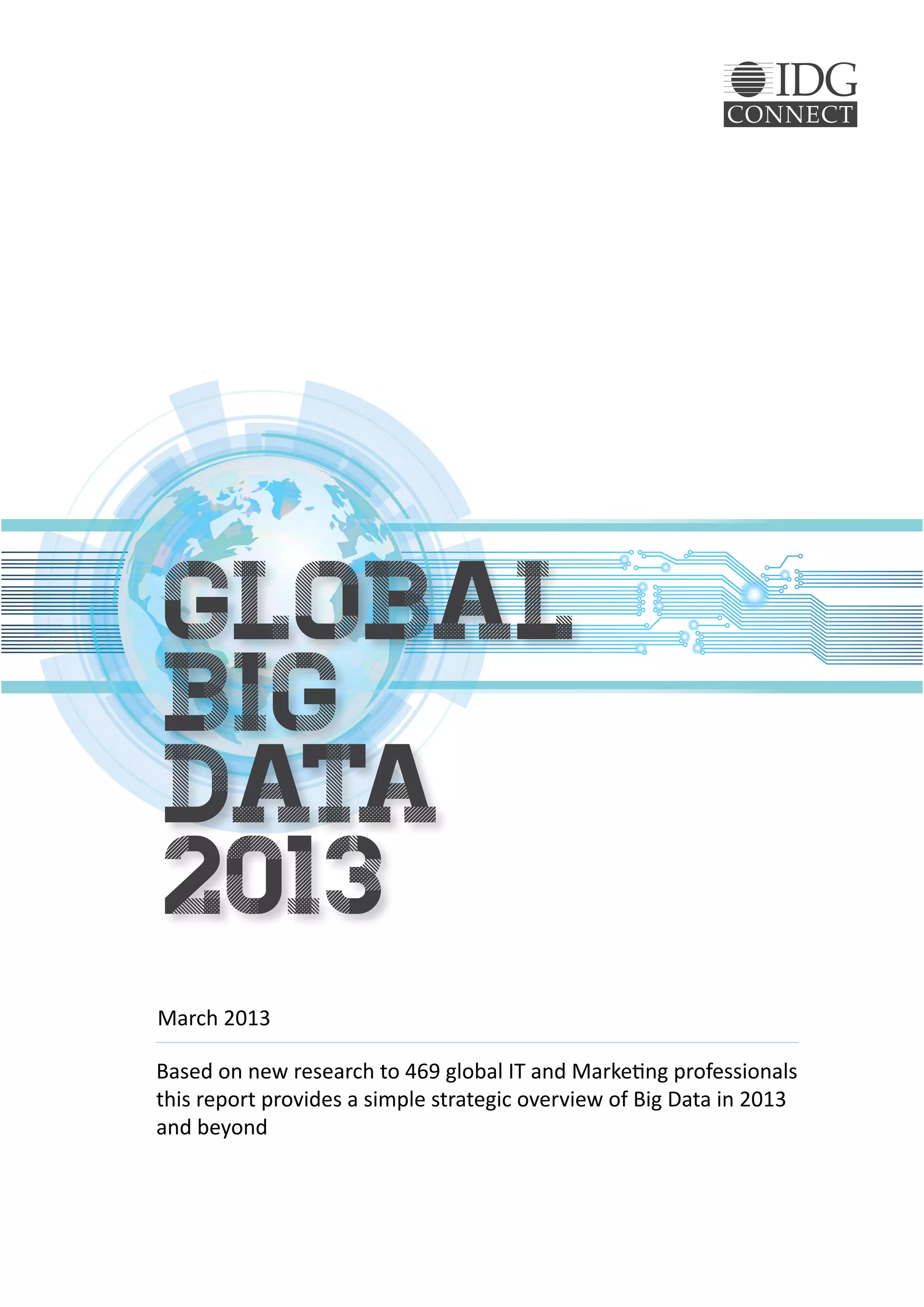 This document provides an overview of big data in 2013 based on a survey of 469 global IT and marketing professionals. It finds that while most see big data as an opportunity, there is a disconnect between IT and marketing departments in how they collaborate on big data initiatives. Both sides agree more investment in data scientists is needed to maximize big data's potential but recognize challenges in skills gaps and a lack of communication between top managers. The future of big data is predicted to grow substantially across industries globally by 2018, though regulations and consumer privacy concerns present challenges that companies must address.
