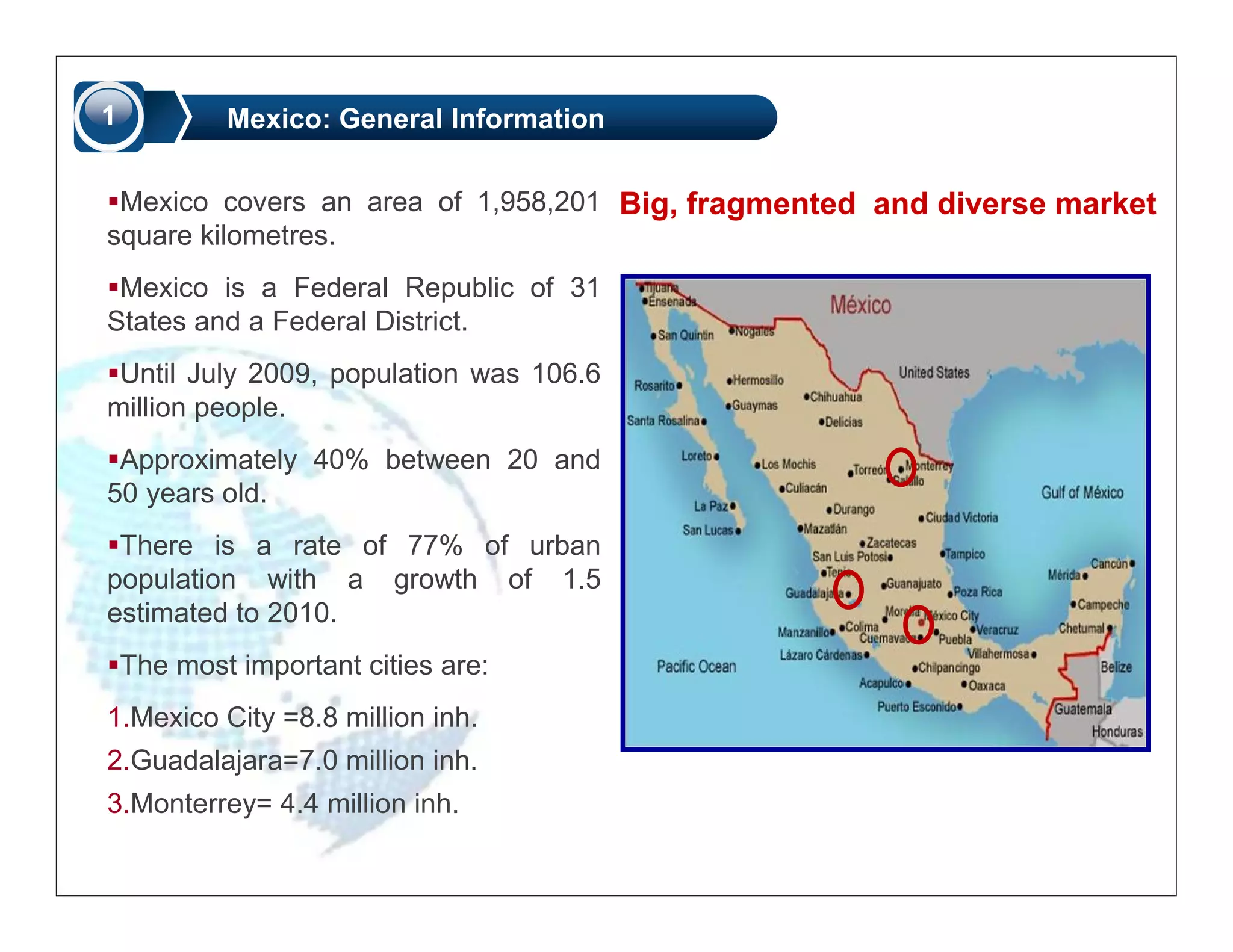 This document provides an overview of opportunities for doing business in Mexico. It summarizes Mexico's population size, GDP, economic growth rates, and sectors with foreign investment opportunities such as manufacturing, automotive, aeronautics, chemicals, electronics, food and beverages, textiles, agriculture, and science and technology. The document also outlines cultural dos and don'ts for operating successfully in Mexico, such as building relationships, observing holidays, and understanding regulations. It positions Global BMT as able to guide foreign companies through business and cultural issues in Mexico.