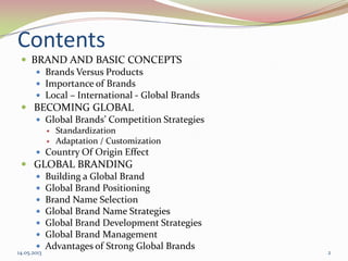 The document discusses the essential concepts of international branding, covering topics such as the differences between local, international, and global brands, brand equity, and competition strategies like standardization and adaptation. It highlights the importance of brand management, positioning, and development strategies while addressing consumer perceptions and the influence of country of origin. Ultimately, the text emphasizes the significance of strong global brands in achieving competitive advantages and financial success.
