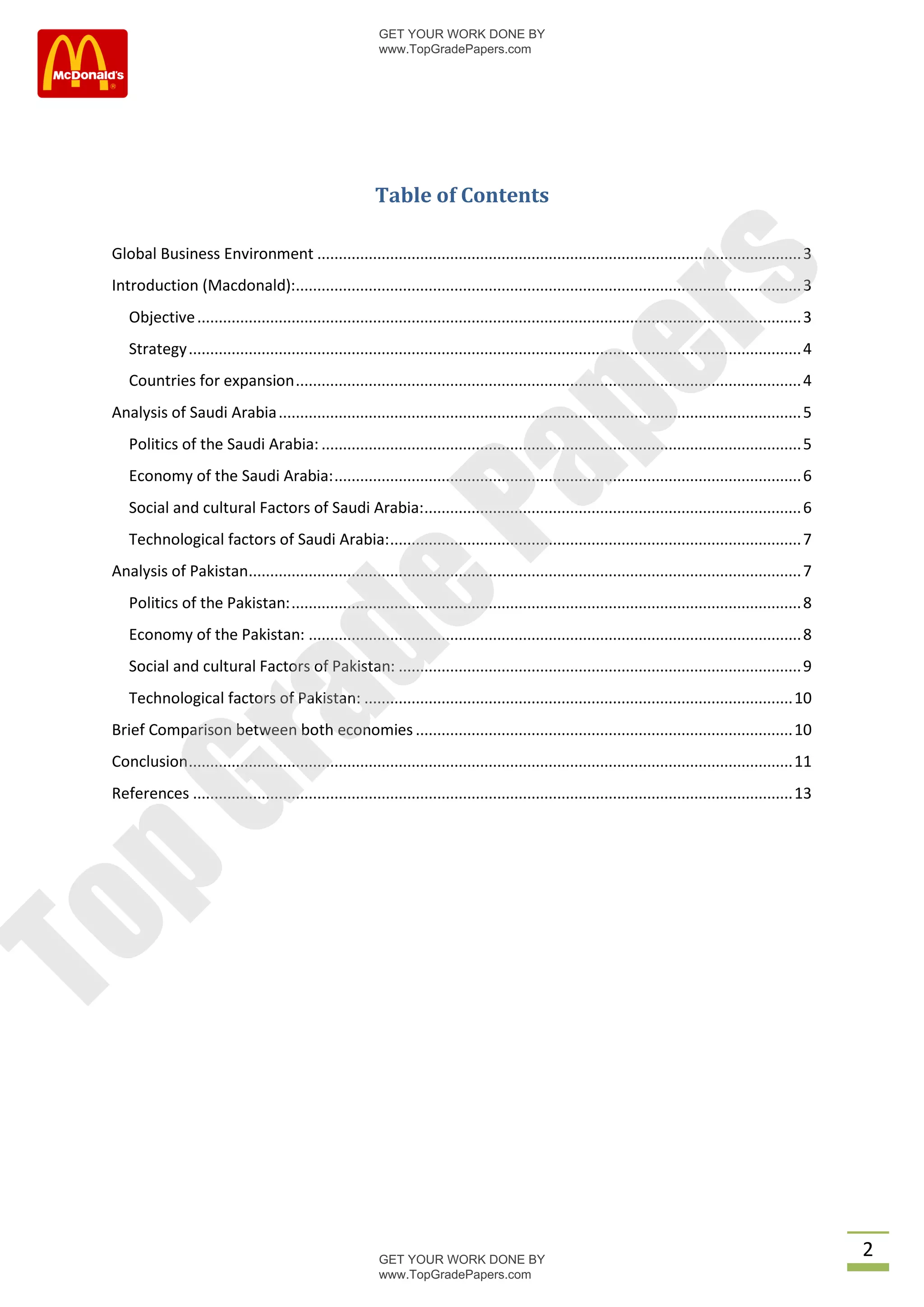 MacDonald is considering expanding its business to either Pakistan or Saudi Arabia. A feasibility report analyzes factors in both countries to determine the most suitable location. Pakistan faces political instability and a weak economy while Saudi Arabia has a stable political system and strong oil-based economy. After comparing factors like GDP, purchasing power, tax rates, and ease of doing business, the conclusion is that Saudi Arabia provides a better environment for MacDonald's expansion goals.