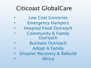 Global Care is the social outreach arm of the International Network of Churches that provides disaster relief and links the church to the community. It offers services like low-cost groceries, emergency food hampers, hospital food outreach, community and family outreach, business outreach, adopting families in need, disaster recovery and rebuilding efforts, and work in Africa. Global Care relies heavily on volunteers to carry out its various social services and relief programs.