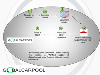 An initiative by four students promotes carpooling in India through a website that allows users to register a profile, search for existing carpools or create their own, invite or join other carpoolers, and enter document details to become a verified pooler. The website aims to help people travel more while paying less through sharing rides.