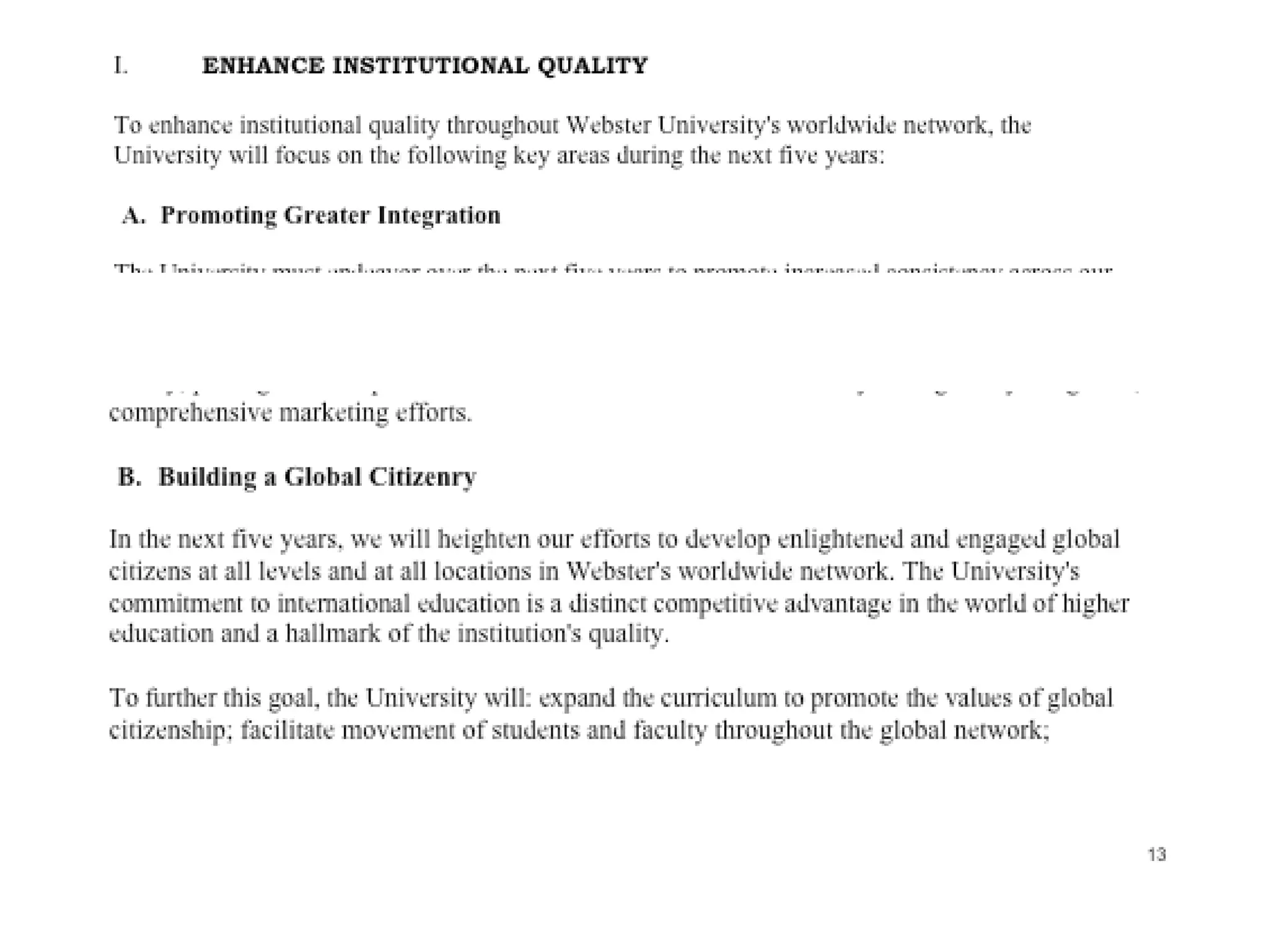 The document outlines the history and development of the Global Citizenship Project Task Force at Webster University, detailing its mission to ensure that all undergraduate students acquire core competencies for responsible global citizenship by 2011. It highlights key milestones in the curriculum reform process, emphasizing the need for assessment plans and integration of interdisciplinary practices to enhance student learning outcomes. The task force aims to create educational programs that foster critical skills, ethical reasoning, and civic engagement among students in a diverse, global context.