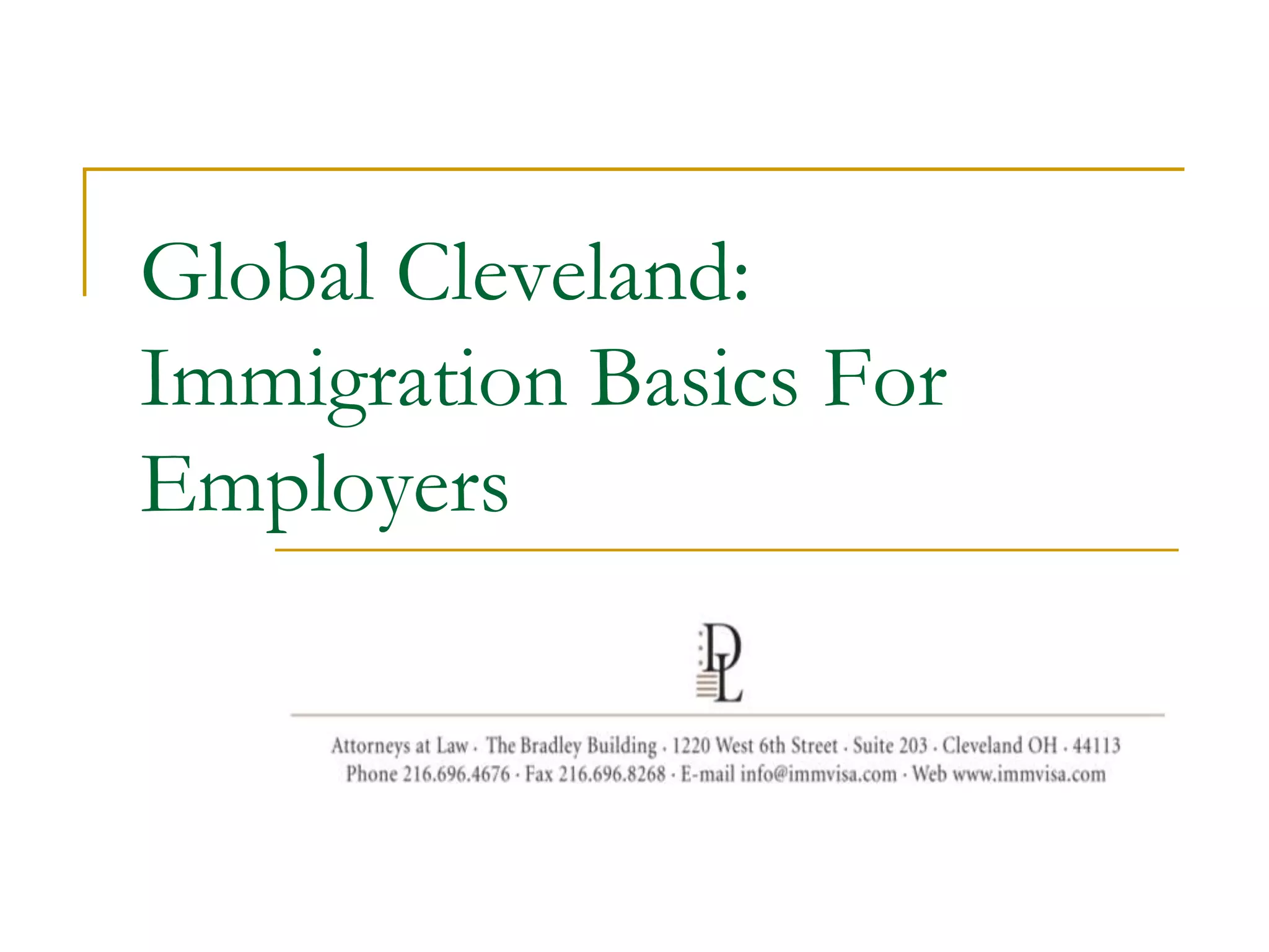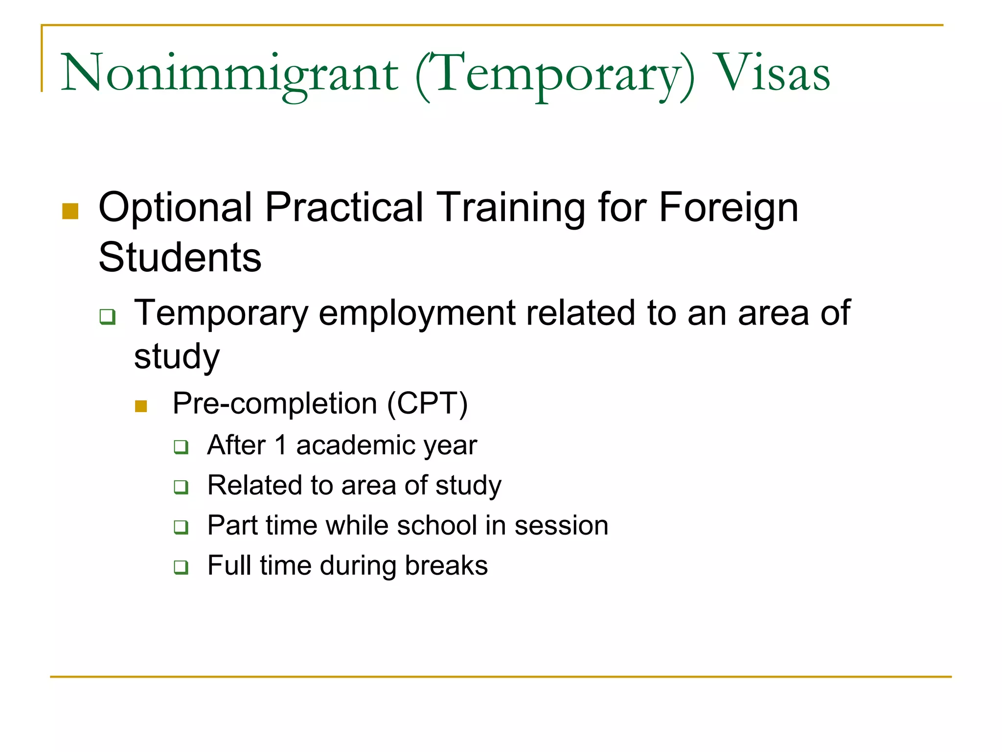 The document provides an overview of different nonimmigrant and immigrant visa categories for employers and foreign workers, including F-1 optional practical training (OPT), H-1B specialty occupation visas, TN visas for Canadian and Mexican professionals, and EB employment-based immigrant visas. It outlines specific eligibility requirements for each visa type, such as educational background, job offers, and employer sponsorship. Additionally, the document touches on immigration reform topics including border security, visa system overhaul, and enhanced electronic employment verification.