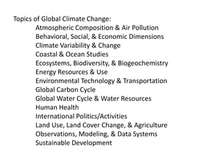 The document discusses topics related to global climate change including atmospheric composition, air pollution, climate variability, coastal and ocean studies, ecosystems, energy resources, environmental technology, global carbon and water cycles, health, politics, land use, agriculture, observations, modeling, and sustainable development. It then provides brief biographies of 16 individuals who are working on issues related to climate change, renewable energy, sustainability, and environmental protection.