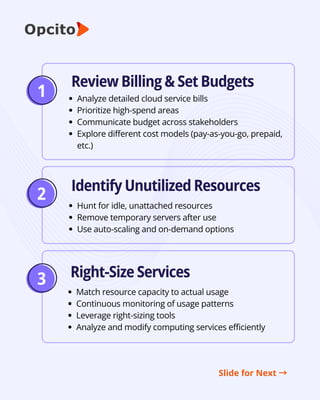 This document outlines nine essential strategies to manage cloud expenses while maintaining performance and scalability. It covers everything from setting cloud budgets and reviewing billing practices to eliminating idle resources, choosing the right architecture, and building a cost-aware culture across teams.