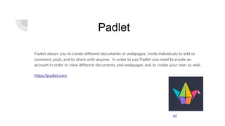 Padlet allows users to create documents and webpages that can be edited and shared by others. It requires creating an account to view, create, and share content. The Center for Interactive Learning and Collaboration works to advance learning across subjects through collaborative technologies and connects teachers to projects within and outside the US. iEARN-USA uses the internet and technologies to engage youth worldwide in collaborative learning and project-based work addressing curriculum and global issues. Collaborize Classroom enables the creation, sharing, and downloading of lessons on different topics and subjects that can be edited, include attachments, and are useful for all types of learners.
