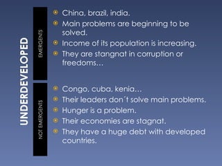 China, Brazil, and India are solving main problems and their incomes are rising, while countries like Congo, Cuba, and Kenya have stagnant economies and leaders not addressing hunger and debt. The solution is not just aid from rich countries but also providing materials to create jobs, businesses, and infrastructure to increase incomes, though developed countries must first bring stability, democracy, and human rights protections. Renewable energy sources will also be needed as scientists say gas and oil will run out within 30-40 years requiring reduced consumption.