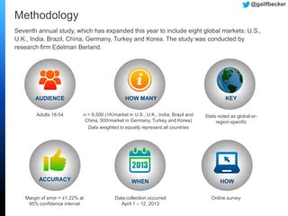 The 2013 Global Entertainment Study analyzes audience engagement and interaction with entertainment across eight global markets, highlighting trends in viewing habits and preferences. Key findings reveal a strong inclination towards multi-device usage while consuming content, along with significant interest in interactive and immersive experiences, particularly in emerging markets like India, Brazil, and China. The study emphasizes the importance of personal recommendations and social media influence in entertainment consumption choices.