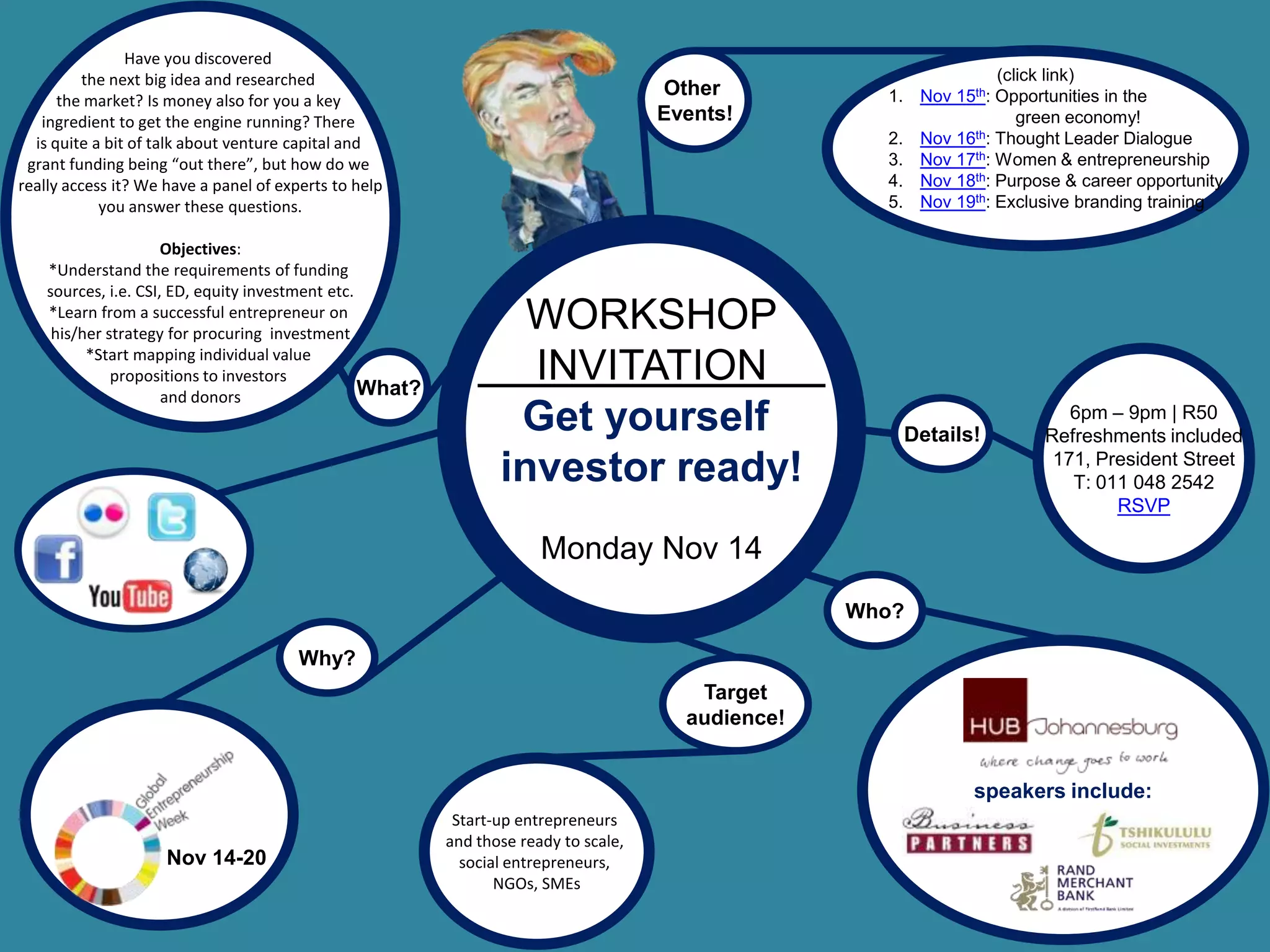 1. A workshop on November 14th to help entrepreneurs get investor ready. It will discuss funding requirements and learning from successful entrepreneurs.
