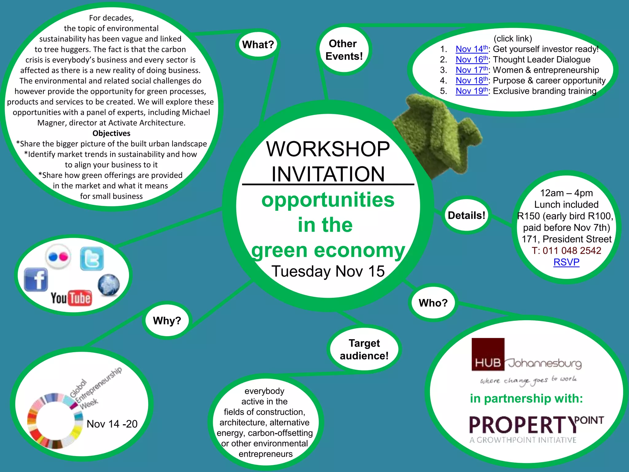 2. An event on November 15th exploring green business opportunities in sectors like construction and energy. It will identify market trends and how businesses can align with sustainability.