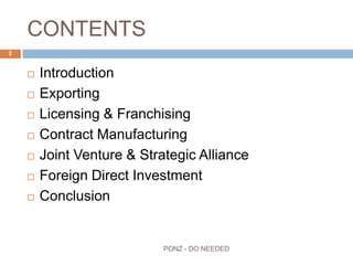 The document discusses various global entry strategies for companies including exporting, licensing and franchising, contract manufacturing, joint ventures and strategic alliances, and foreign direct investment. It provides brief definitions and examples of each strategy, noting that companies need to adopt a global strategic plan to effectively enter world markets as trade barriers fall. The strategies allow firms to access new markets, technologies, and expertise in a quicker and lower risk manner.