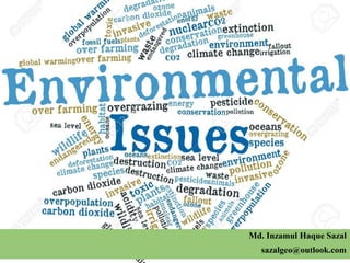 The document provides an extensive overview of environmental issues caused by human activities, outlining their causes, effects, and possible mitigation strategies. It discusses various global and local environmental challenges, including pollution, resource depletion, and biodiversity loss, particularly highlighting the significant issues faced by Bangladesh such as climate change and water pollution. It emphasizes the importance of collective action from individuals, governments, and organizations to address these pressing environmental concerns.