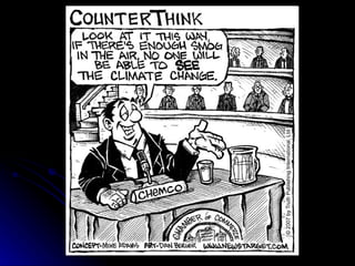 3) It reviews two major international agreements - the Montreal Protocol which regulated ozone depleting substances and the Kyoto Protocol which aims to reduce greenhouse gas emissions. Key aspects of these agreements and their relative success are summarized.