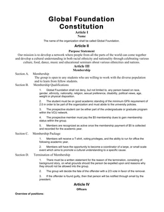 The constitution establishes the Global Foundation organization to develop cultural understanding through celebrating various cultures.