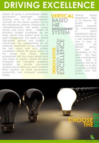 Global HR group is an Ahmedabad-based recruitment company that focuses on HR management for various business sectors such as engineering, pharma, infrastructure, IT, real estate, and power. They provide suitable candidates for all levels of management. They have 6 industry-focused verticals that help them better understand requirements and improve service quality. Their services include permanent staffing, flexi hiring, payroll processing, and workplace discipline management to improve productivity and loyalty.