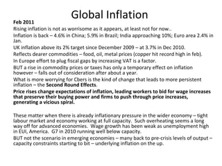 Global inflation is increasing due to rising commodity prices, with inflation around 6% in Brazil, 10% in India, and 2.4% in the Euro area. However, much of the price increases are due to temporary factors like weak harvests or tax increases. Core inflation excluding food and fuel has risen much less. Emerging markets face more risk of persistent inflation as their economies are growing faster and monetary conditions are looser than in 2008. Tighter fiscal policy through reduced budget deficits would be a better tool than interest rates for emerging markets to fight inflation.