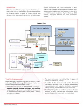 3) Mukesh described how the White Knight used their generic insurance testing repository to quickly understand requirements gaps and design comprehensive test cases, finding critical defects early. Their approach helped complete the project on time and under budget.