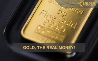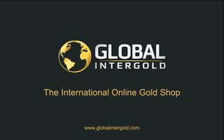 Global Intergold is an online gold shop established in 2010, providing high-quality physical gold bars with a purity of 999.9 from top producers. The shop offers a Goldset marketing incentives program allowing clients to purchase gold with minimal cash outlay while building personal gold reserves through promotional activities. Clients can also engage in a leadership program to generate long-term income and stability in the gold market.