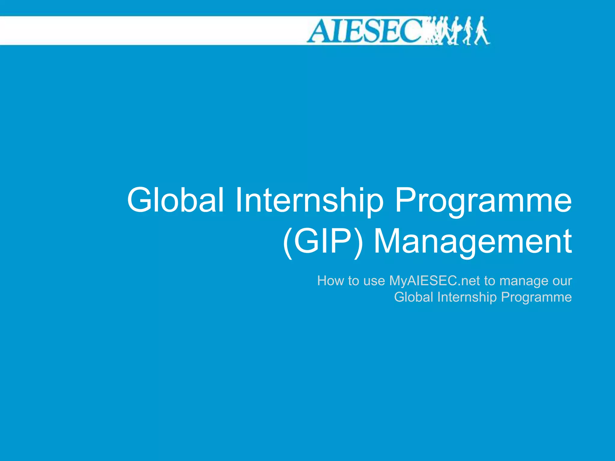The document provides instructions for using MyAIESEC.net to manage the Global Internship Programme (GIP). It describes how members can become part of GIP as exchange participants (EPs) by choosing to move to GIP and look for exchanges or by finding and applying to GIP opportunities. It also explains how EPs can use the GIP menu to manage their forms, track matching progress, and search for opportunities. Managers are appointed to oversee EP and training exchange (TN) forms. The Team Member and Team Leader menus give managers tools to facilitate the exchange process.