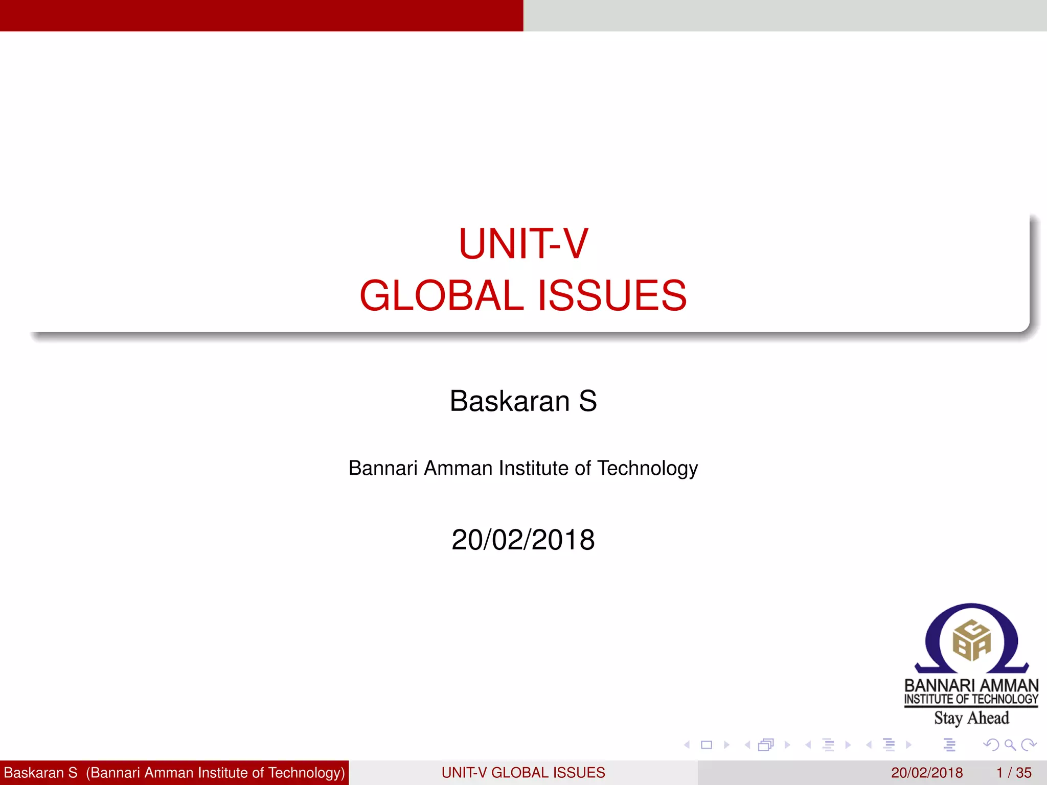 This document outlines a unit on global issues presented by Baskaran S from Bannari Amman Institute of Technology on February 20, 2018. It covers objectives of understanding multinational corporations, globalization, technology transfer, and international rights. Specific topics discussed include the definition of multinational corporations, top MNCs, elements of globalization, the process of technology transfer, and establishing companies in India as a foreign business. Computer ethics and intellectual property are also examined.