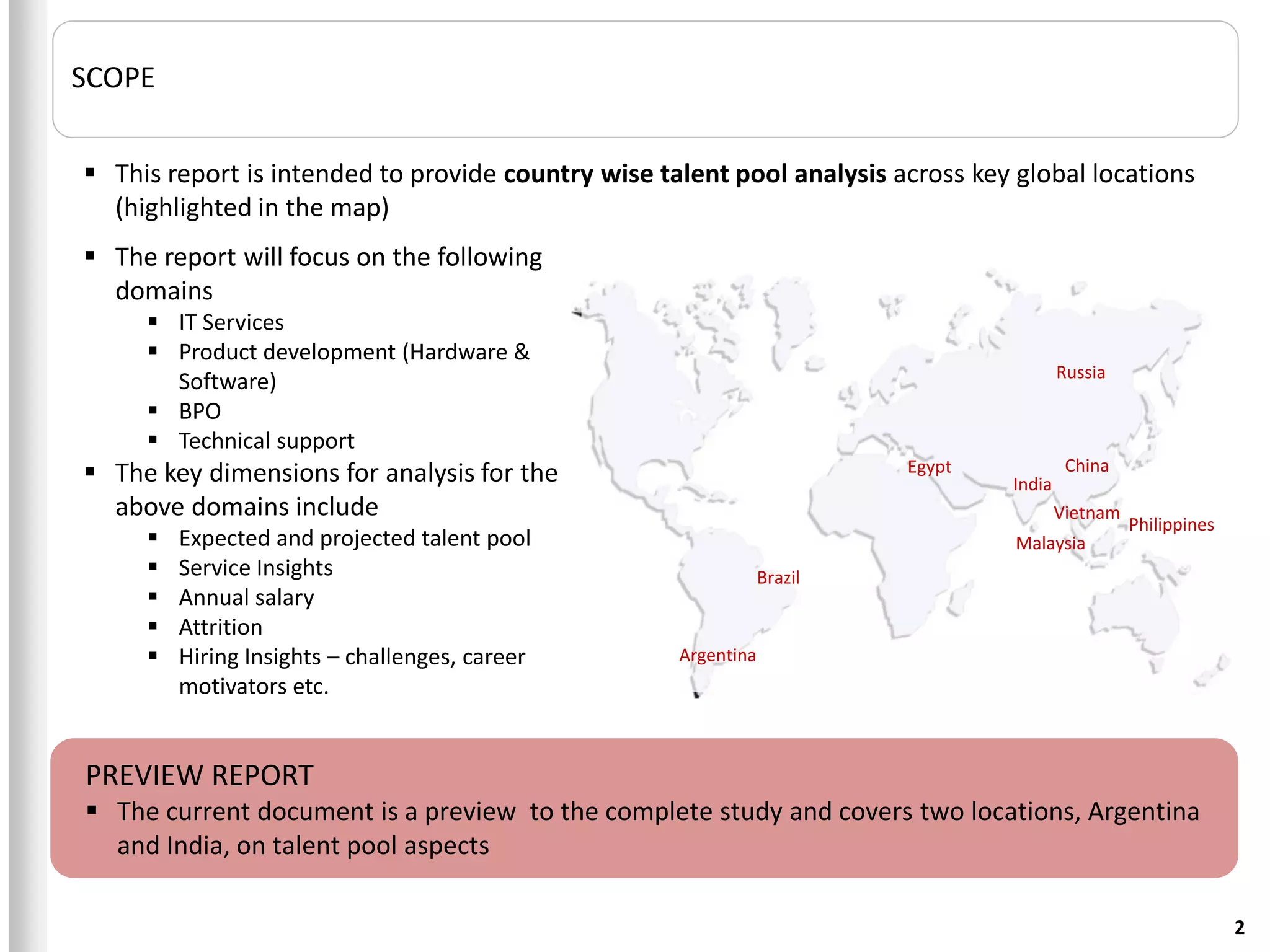 The document is a preview report analyzing the talent pool in Argentina and India across IT services, product development, BPO, and technical support sectors. It highlights Argentina's educated workforce, cost advantages, and challenges in hardware development, while India's strong technology integration and economic growth contribute to a large talent pool. The report emphasizes the importance of annual salary and brand value as key factors influencing career decisions in both countries.