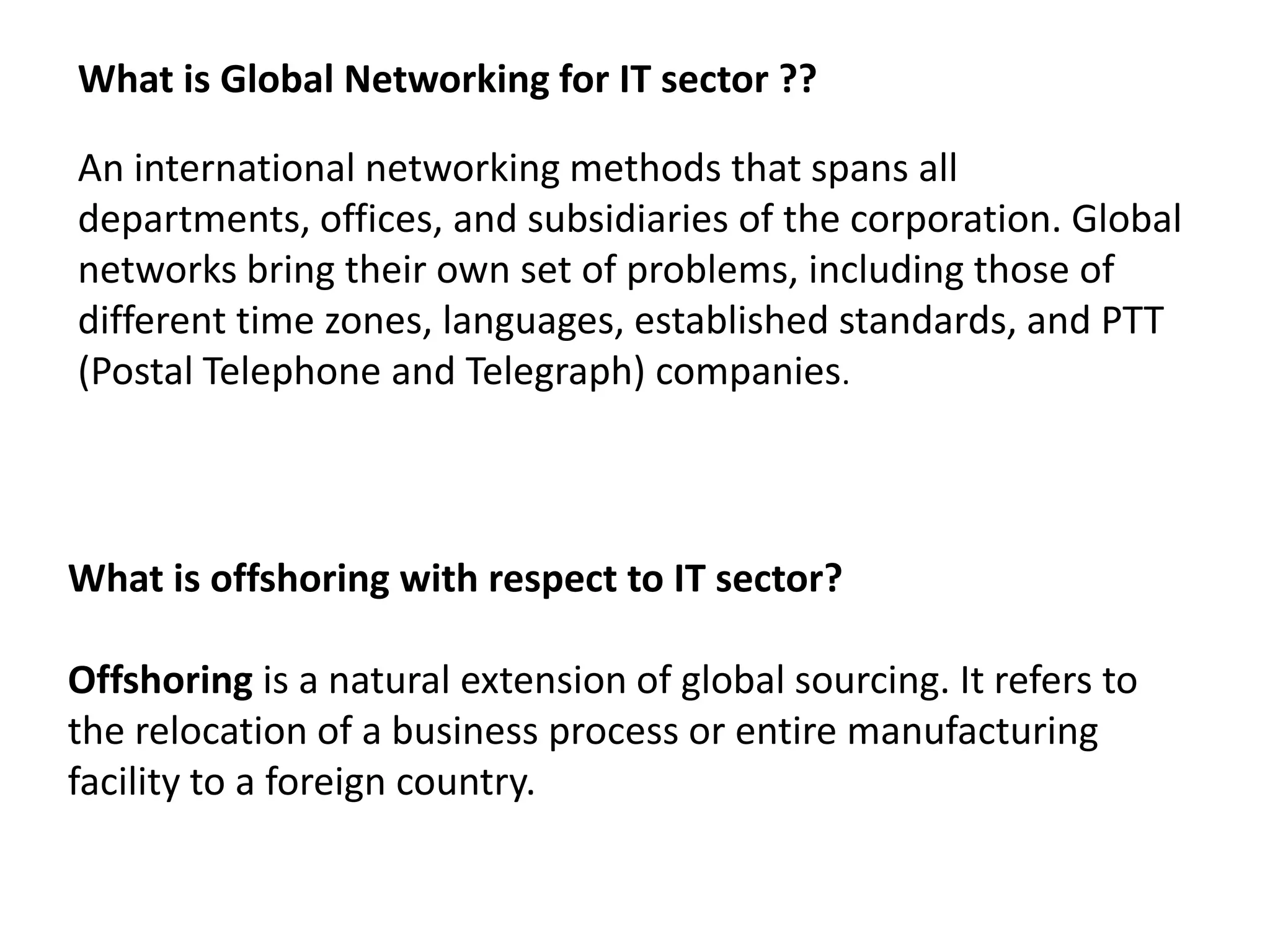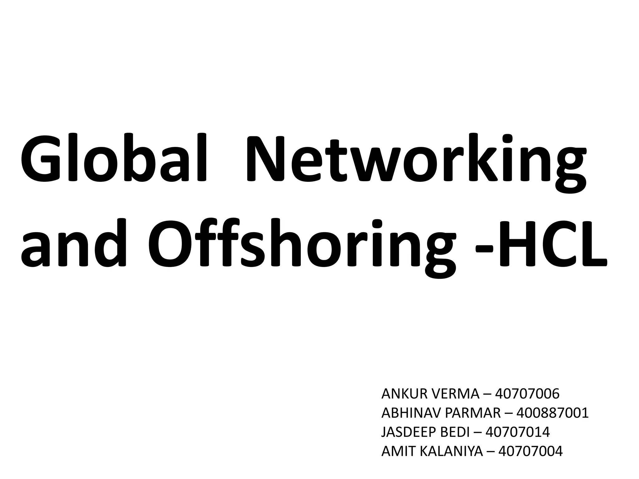 Global networking refers to methods that connect all departments, offices, and subsidiaries of a corporation across international borders, bringing challenges like different time zones and standards. Offshoring involves relocating business processes or facilities to foreign countries to reduce costs. HCL is a leading global IT company founded in 1976 with over 80,000 professionals operating in 31 countries. It has expanded through offshoring by acquiring foreign companies and establishing joint ventures to address opportunities in markets like finance. While most functions can be offshored, there are risks to consider like lower savings than expected or inadequate local skills that companies try to mitigate through strategies like supplier development.