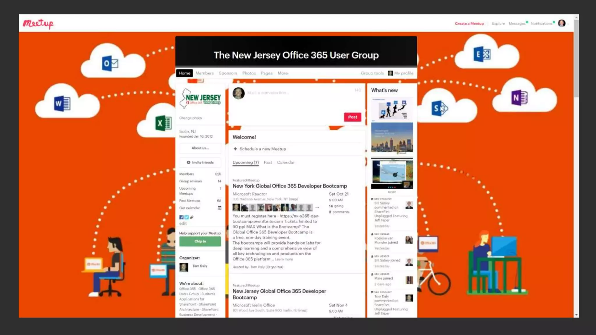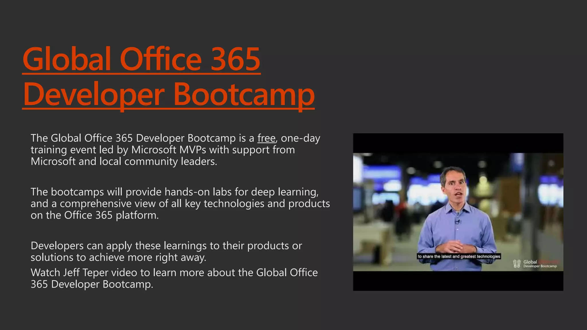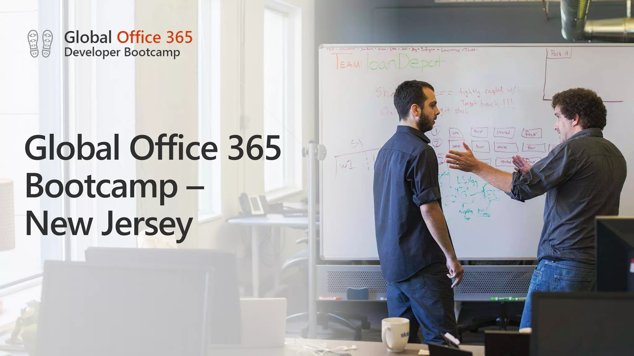 The document summarizes a Global Office 365 Developer Bootcamp event taking place in New Jersey. The free one-day event will provide hands-on labs and training sessions led by Microsoft MVPs on key Office 365 technologies and products, including Office UI Fabric, SharePoint Framework, and building web parts with React. The agenda lists sessions on topics like intro to SharePoint patterns and practices, building SPFx web parts, and Microsoft Teams architecture. Lunch and venue are sponsored by Microsoft.