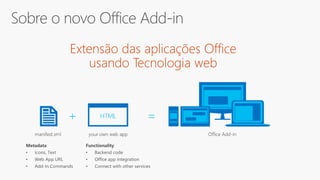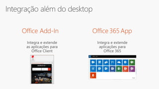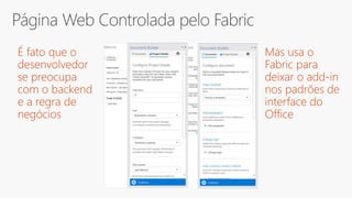The document discusses Office UI Fabric, a framework for building user interfaces across Office 365 applications. It covers elements like typography, iconography, responsive layouts, and localization considerations, highlighting the integration of CSS classes for consistent design. Additionally, it includes resources for implementation, tooling, and recent updates to the framework.