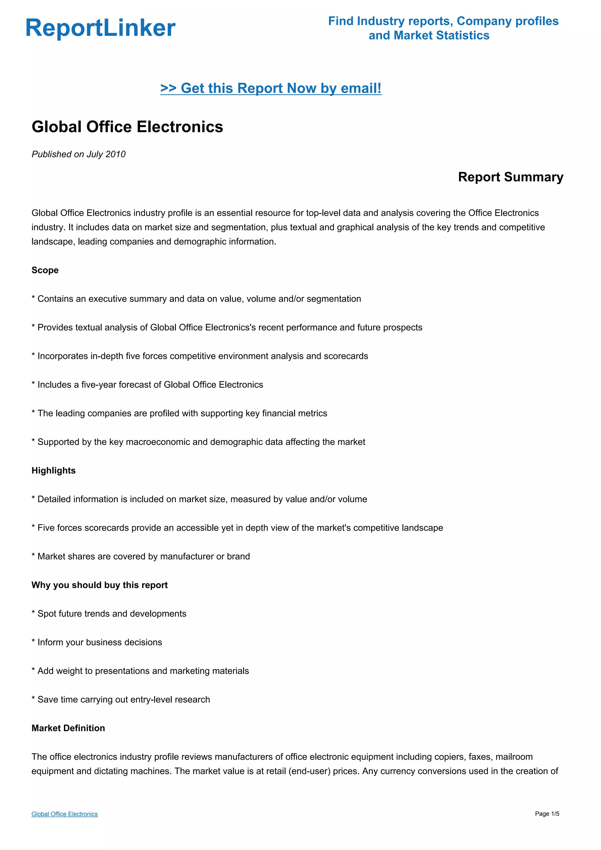 The Global Office Electronics industry report provides comprehensive data on market size, segmentation, and key trends within the sector. It includes competitive analysis, profiles of leading companies, and market forecasts covering 2009-2014. Additionally, the report aims to support business decisions and market strategies with detailed insights and financial metrics.