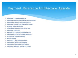 The document outlines the Payment Reference Architecture, detailing frameworks, building blocks, and capabilities necessary for enterprise payment systems. It discusses components like transaction hubs, compliance checks, data warehouses, and business monitoring to enhance payment processing efficiency and reliability. Additionally, it highlights key differentiators and agile approaches for implementing effective banking solutions by the enterprise banking architects.