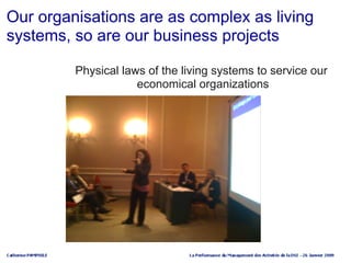 1. Living systems like organizations follow natural laws of self-adjustment, interdependence, and diversity. 2. To be successful, management of projects and organizations should respect these principles by allowing self-adjustment to changes, recognizing interdependence between parts, and encouraging diversity. 3. An approach combining systemic factors like communication, participation, adaptation, and quality of access to information can help management respect these natural laws and boost performance.