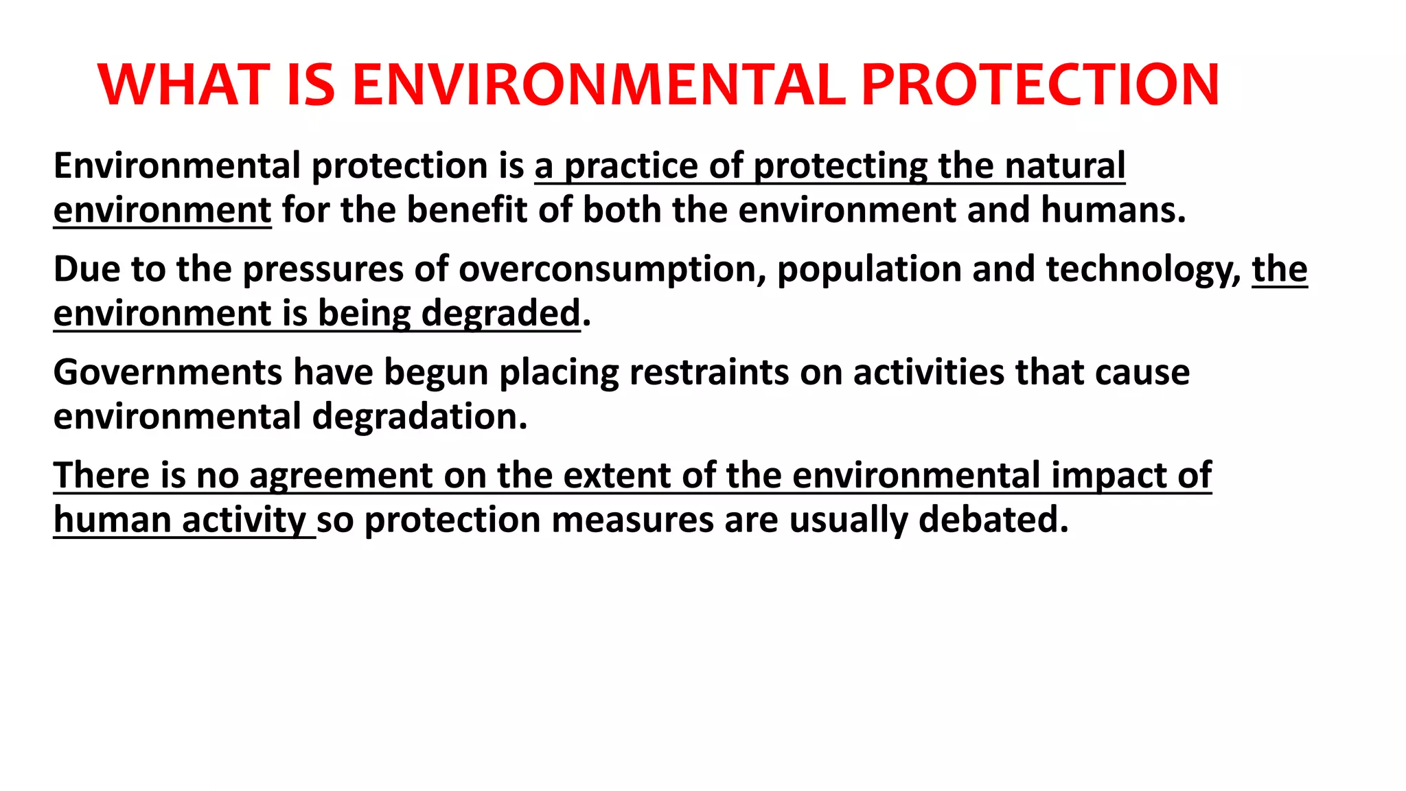 Environmental protection aims to safeguard the natural environment for humans and ecosystems, facing challenges from overconsumption and technology. The environmental movement advocates for sustainability through activism and public policy and has evolved to address issues like global warming and genetic engineering. In New Zealand, the environmental movement gained momentum in the 1960s, leading to the establishment of political parties and notable campaigns against major ecological threats.