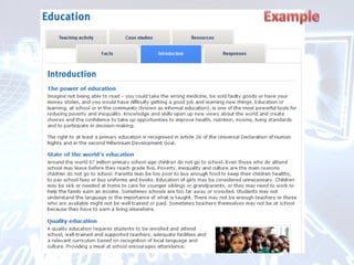 - Students play an active role in co-creating their learning experience through project-based work on issues like gender equality, citizenship, and education access.