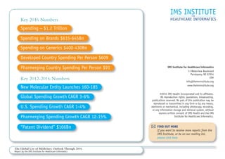 The document summarizes key projections about global spending on medicines from 2012 to 2016. It finds that global spending will reach nearly $1.2 trillion by 2016, with developed markets' share declining to 57% as pharmerging markets increase their share to 30% through population and economic growth. There will be an accelerated shift to generics and biosimilars, accounting for $4-6 billion, while off-invoice discounts and rebates are estimated to reach $180-190 billion in 2016, lowering estimated global spending. New medicines are expected to transform treatment for diseases like cancer and Alzheimer's, though some gaps in available treatments will remain.