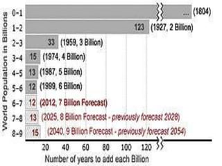 The document discusses global population growth and its variations among different nations. It notes that while some nations have very high growth rates above 3%, others have stable or even declining populations. The world population reached 7 billion in 2011 according to the UN and is projected to reach over 10 billion by 2050 if current growth trends continue. Rapid population growth puts pressure on natural resources and can degrade the environment if demands for food, water and energy are not met sustainably.
