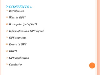 The document discusses the Global Positioning System (GPS). GPS is a satellite-based navigation system consisting of three segments - space, control, and user. The space segment includes 24 satellites that transmit radio signals used by GPS receivers to determine location, velocity, and time. The control segment monitors the satellites and updates their clocks. The user segment includes GPS receivers that calculate position by precisely timing signals from at least three satellites. Common sources of error and differential GPS for improving accuracy are also covered, as well as many applications of GPS technology.