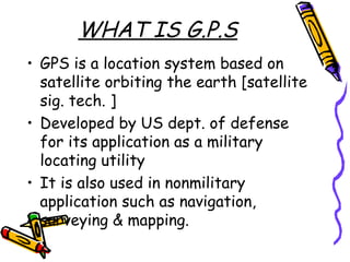The document discusses the Global Positioning System (GPS). It describes GPS as a satellite-based navigation system developed by the U.S. Department of Defense that provides accurate positioning, navigation, and timing services to users worldwide. GPS uses 24 satellites orbiting the Earth to transmit signals that allow GPS receivers to determine their precise location. The system has three segments - the space segment consisting of satellites, the control segment that monitors and maintains the satellites, and the user segment of anyone using a GPS receiver. GPS enables accurate positioning for applications like navigation, mapping, and surveying.