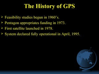 GPS uses a constellation of satellites and ground stations to provide location and time information to receivers. It operates in three segments: the space segment consisting of satellites, the control segment of ground stations that monitor the satellites, and the user segment of GPS receivers. GPS works by precisely measuring the time for signals to travel from satellites to a receiver, allowing the receiver to triangulate its position using signals from at least three satellites. Sources of error include factors like atmospheric conditions and receiver noise, but accuracy is improved using techniques like differential GPS which corrects errors.