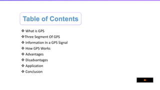 This document discusses the Global Positioning System (GPS). It contains sections on what GPS is, its three segments including space, control, and user segments, how GPS signals work, how GPS determines location using triangulation of signals from multiple satellites, advantages like easy navigation and tracking, disadvantages like inaccuracy and failures, and applications such as location, mapping, and timing synchronization. In conclusion, GPS is a very useful satellite-based navigation system for activities like adventures and water navigation, despite some limitations.