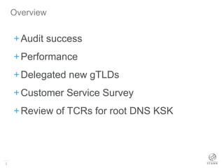 The IANA activities update from April 2014 highlights the successful completion of security audits for their registry management systems and the delegation of over 220 new gTLDs since October 2013. It emphasizes high customer satisfaction and ongoing efforts to improve engagement and participation in surveys. Additionally, it reviews the roles of volunteers in overseeing ICANN's management of the root DNS KSK and outlines the scope of IANA functions regarding global address spaces.