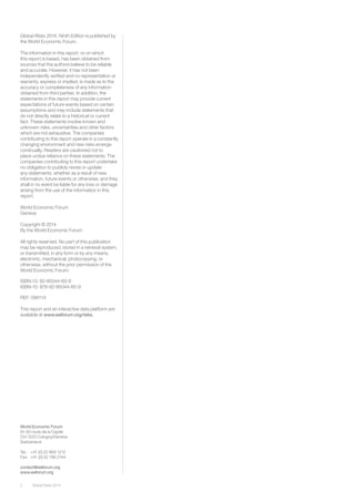 The Global Risks 2014 report, published by the World Economic Forum, outlines interconnected systemic risks threatening stability across economic, environmental, geopolitical, societal, and technological dimensions. Highlighting 31 global risks, the report emphasizes the need for collaboration among business, government, and civil society to enhance resilience against these evolving threats. Key concerns identified include fiscal crises, unemployment, and environmental challenges, underscoring the urgency for long-term strategies in risk management.