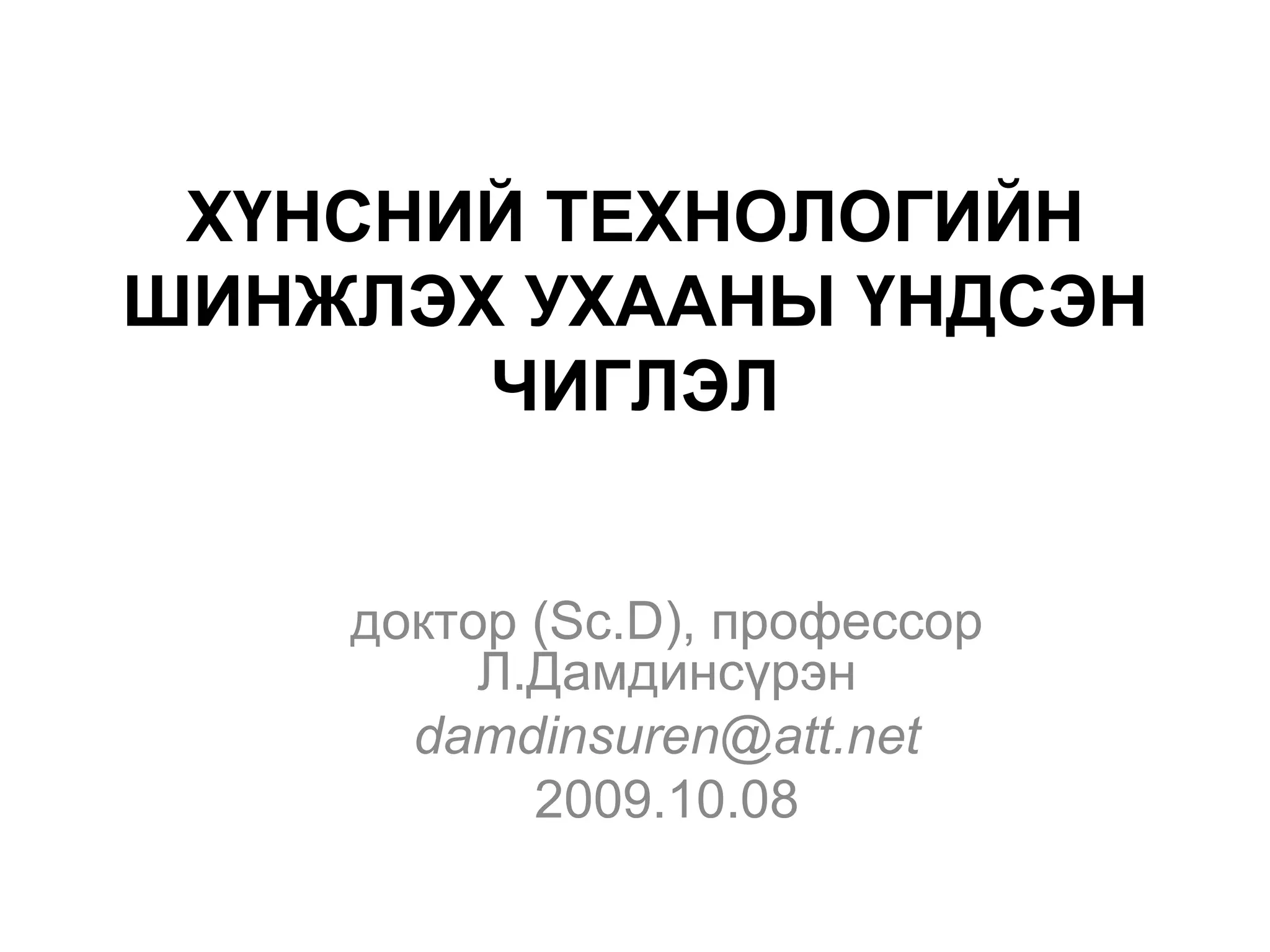 Хүнсний технологийн шинжлэхухаан Үндсэн зарчим Техникийн шинжлэх ухааны нэг салбар Биологи, хими, физик, инженерийн ухааны ололтод тулгуурлана Техник, технологи гэж ярихдаа “техникийн шинжлэх ухаан” –ыг ойлгодог бол “технологи” гэдэг ойлголт нь үйлдвэрлэлийн арга, тоног төхөөрөмж, багаж, хэрэгслийн багтаана Хүнсний технологийн шинжлэх ухаан нь маркетингийн онолоор бол хэрэгцээ, эрэлтийг цөм болгож, шинжлэх ухааны логикоороо хүнсний технологийн хөгжлийн хандалгын чиг баримжаа Зарим гажуудал “ хүнс судлал” гэж шинжлэх ухааны аль чиглэлд хамаарах нь үл ойлгогдох томъёолол Судалгаа, шинжилгээнд “эмчилгээний хүнс хоол” голлох хандлага газар авч, үүнд нь бизнесийнхэн болон хэрэглэгч төөрөгдсөөр байна. Мөн “хүнс үйлдвэрлэл” гэдэг ерөнхий нэрийн дор хүнсний үйлдвэрийн шинжлэх ухаан, технологийн асуудал бүрхэгдсэн шинжлэх ухааны зардлын ихэнх нь хөдөө аж ахуйд зориулагдаж байгаад шүүмжлэлтэй хандах хэрэгтэй - 4.