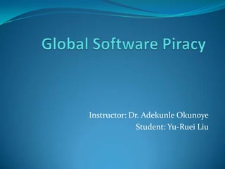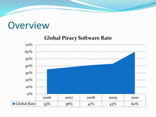 This document discusses factors that influence software piracy rates and methods to reduce piracy. It examines economic, cultural, technical, and regulatory reasons for differences in piracy rates. It also outlines technological approaches like online monitoring of auctions and peer-to-peer networks and economic strategies such as price discrimination and increased user support that can help combat software piracy.