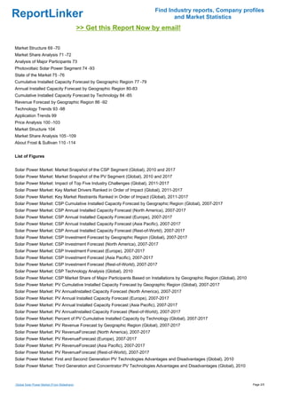 The global solar power market has seen significant growth due to rising energy prices, government incentives, and concerns about energy security over the past three years. The report provides a comprehensive analysis of market trends, forecasts for revenues and installed capacities, and identifies key drivers and challenges in the industry. It includes detailed examinations of the concentrating solar power and photovoltaic segments, among other critical insights.