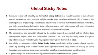 The global sticky notes feature in the Geminate software enhances user productivity by allowing users to create, share, and manage notes across the Odoo ERP system seamlessly. This versatile tool improves organization and teamwork, saving time and streamlining workflows while ensuring compatibility with both Odoo Enterprise and Community editions. Users can easily access support, customization options, and receive complimentary support for 60 days after implementation.