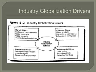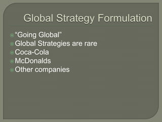 This document provides an overview of key concepts in global strategy formulation. It discusses factors that drive industry globalization and unique risks of operating globally. It examines different global strategies like standardized, tailored, and changed approaches. It also analyzes Walmart's transformation into a major global company through international expansion focused initially in Americas, then China. Walmart exploited buying power, domestic competencies, and learned through local adaptations in different market entries.